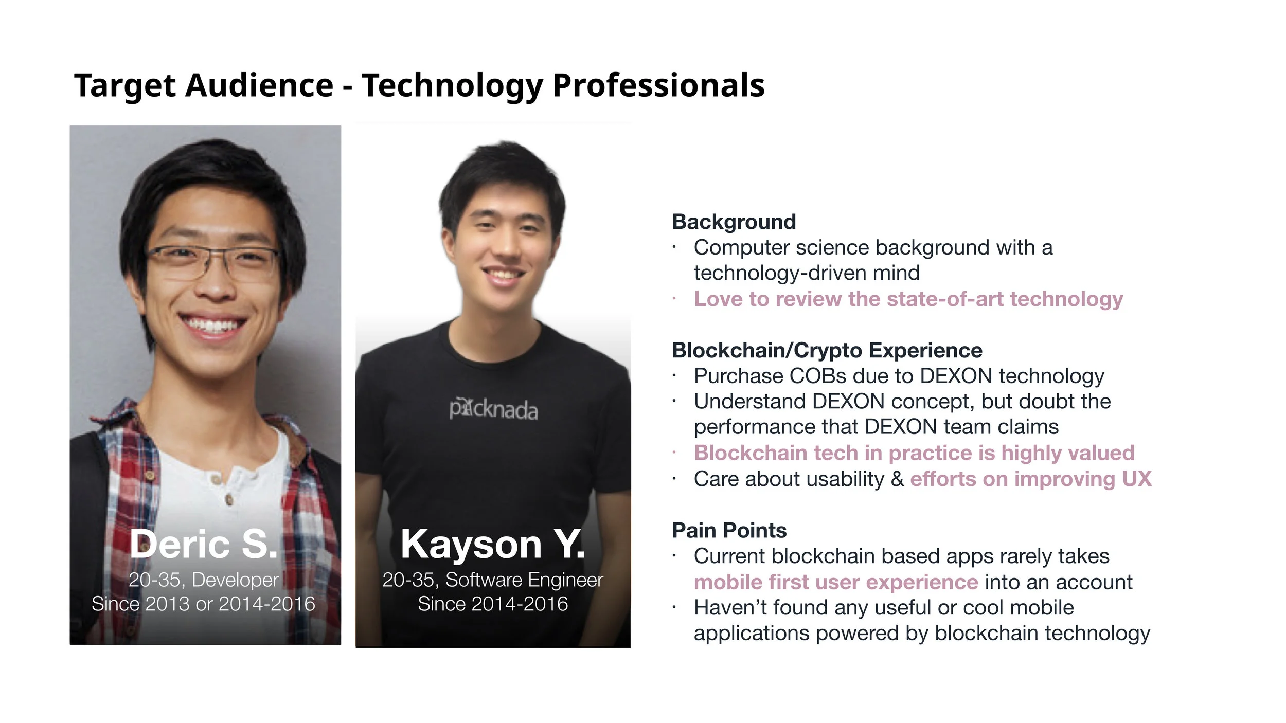 Our primary target for launch became Technology Professionals - key opinion leaders in online tech communities, early blockchain adopters, and the most likely to build on and evangelise the ecosystem. Their frustration was clear: blockchain tech in practice was highly valued, but current apps ignored mobile-first experience entirely.