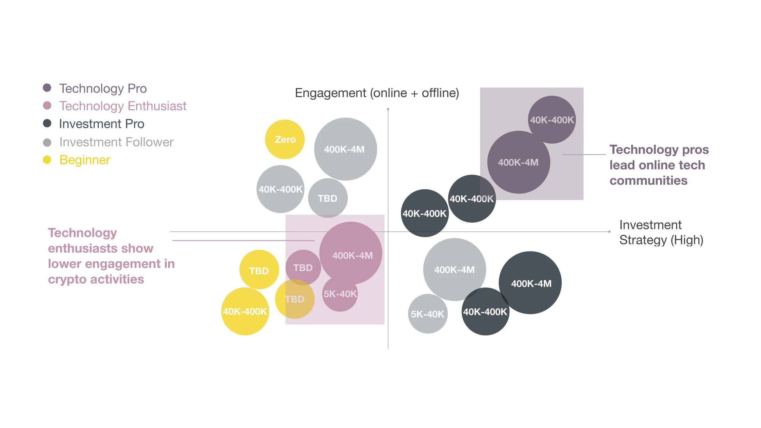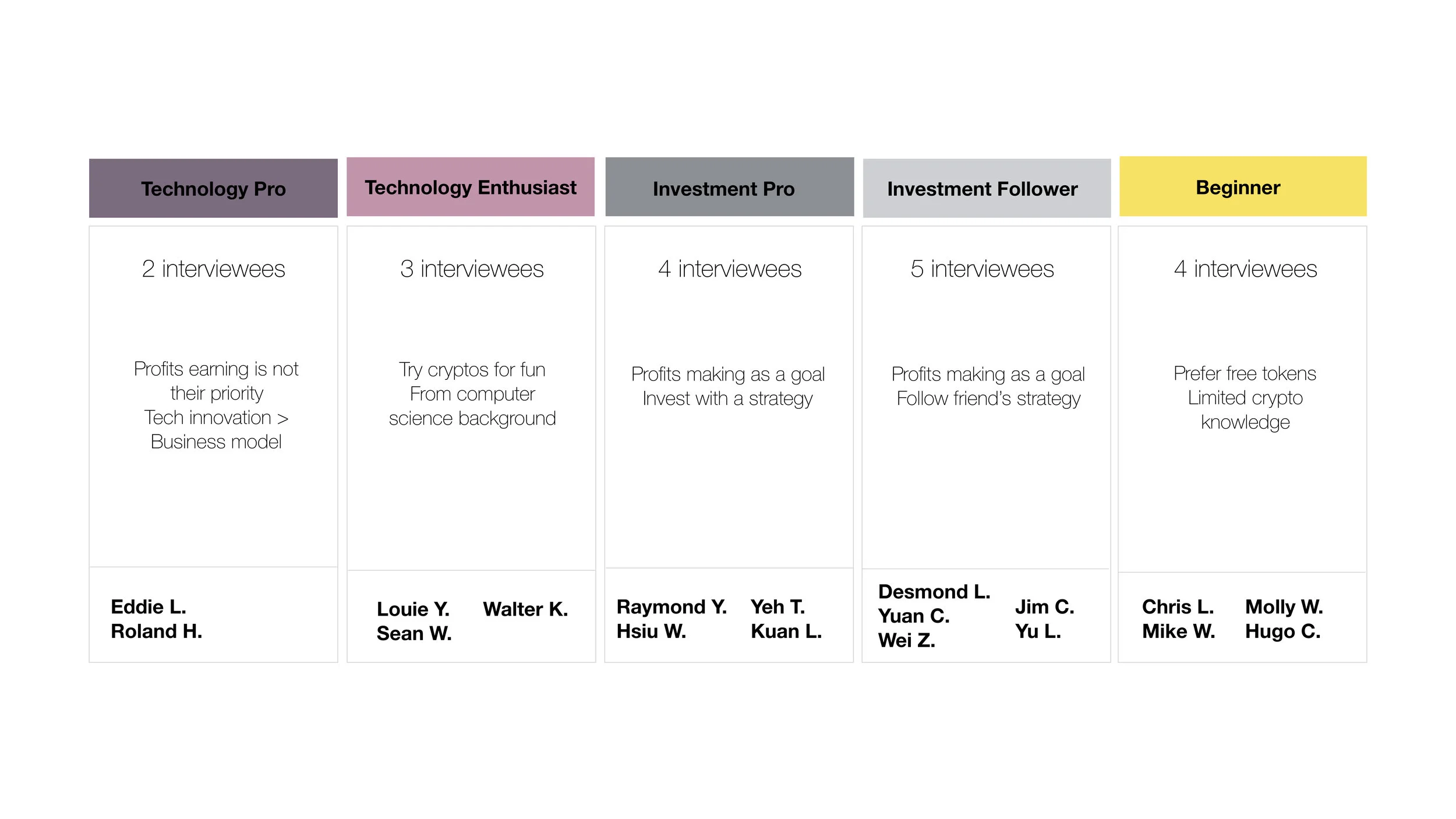One finding shaped everything that followed: Technology Enthusiasts showed significantly lower engagement in actual crypto activity than Investment Pros, despite being the most curious. Designing only for the most active users would miss the majority of people we needed to reach.